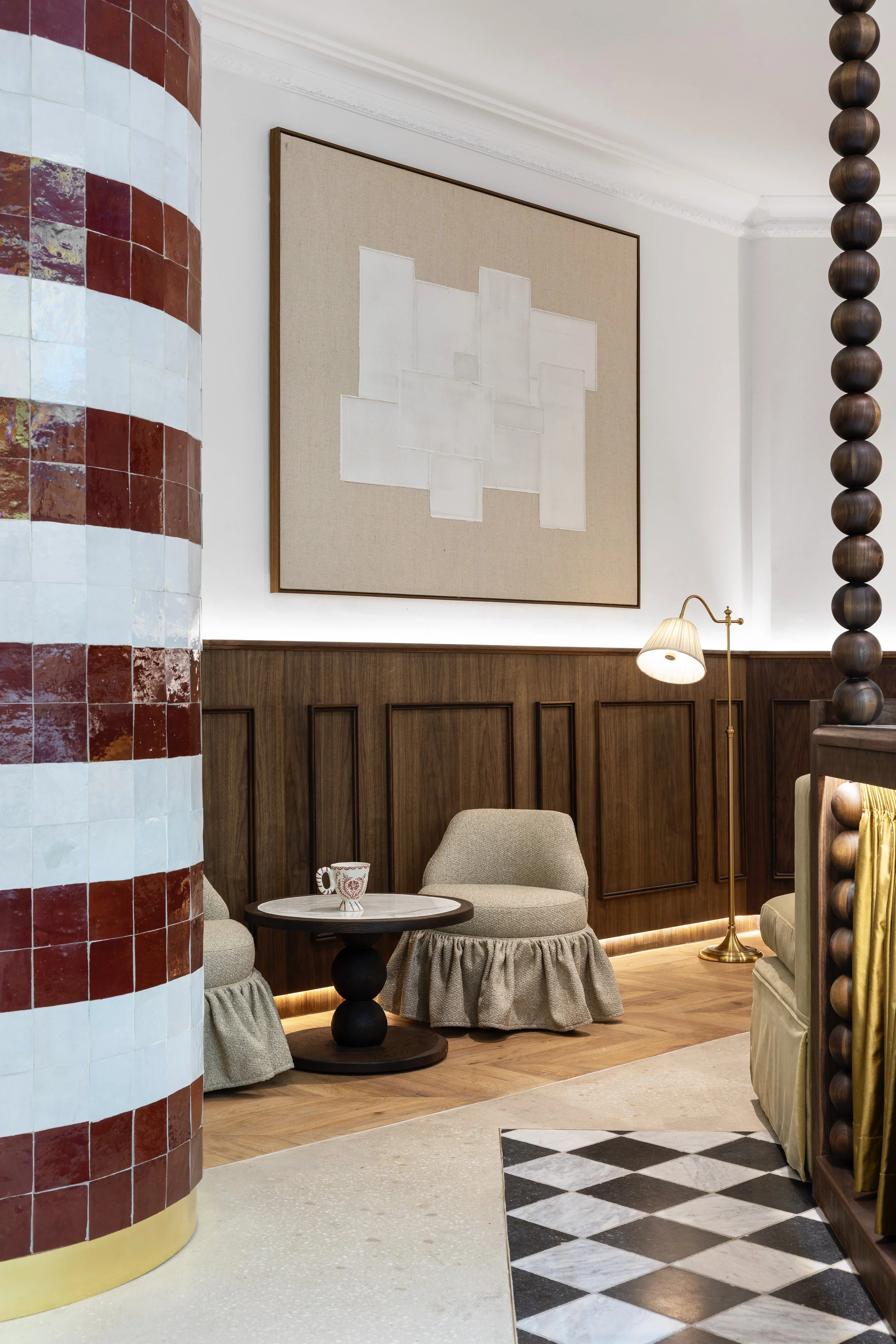 Inspired by the timeless charm of Provence and the Côte d'Azur, the space blends Mediterranean warmth with Parisian sophistication. Rich walnut paneling and solid oak floors ground the interior in craftsmanship and depth, while a checkerboard marble floor adds playful geometry beneath soft ambient light. At its heart, a sculptural plaster island, inspired by scoops of gelato, becomes a focal point framed by turned timber columns and golden silk skirting. Velvet and silk upholstery evoke the relaxed glamour of French Riviera hotel lounges, complemented by Moroccan burgundy tiles and sculptural brass lighting that cast a golden glow over curated art. The result is both nostalgic and new, a celebration of gelato through a lens of continental sophistication and local craft.