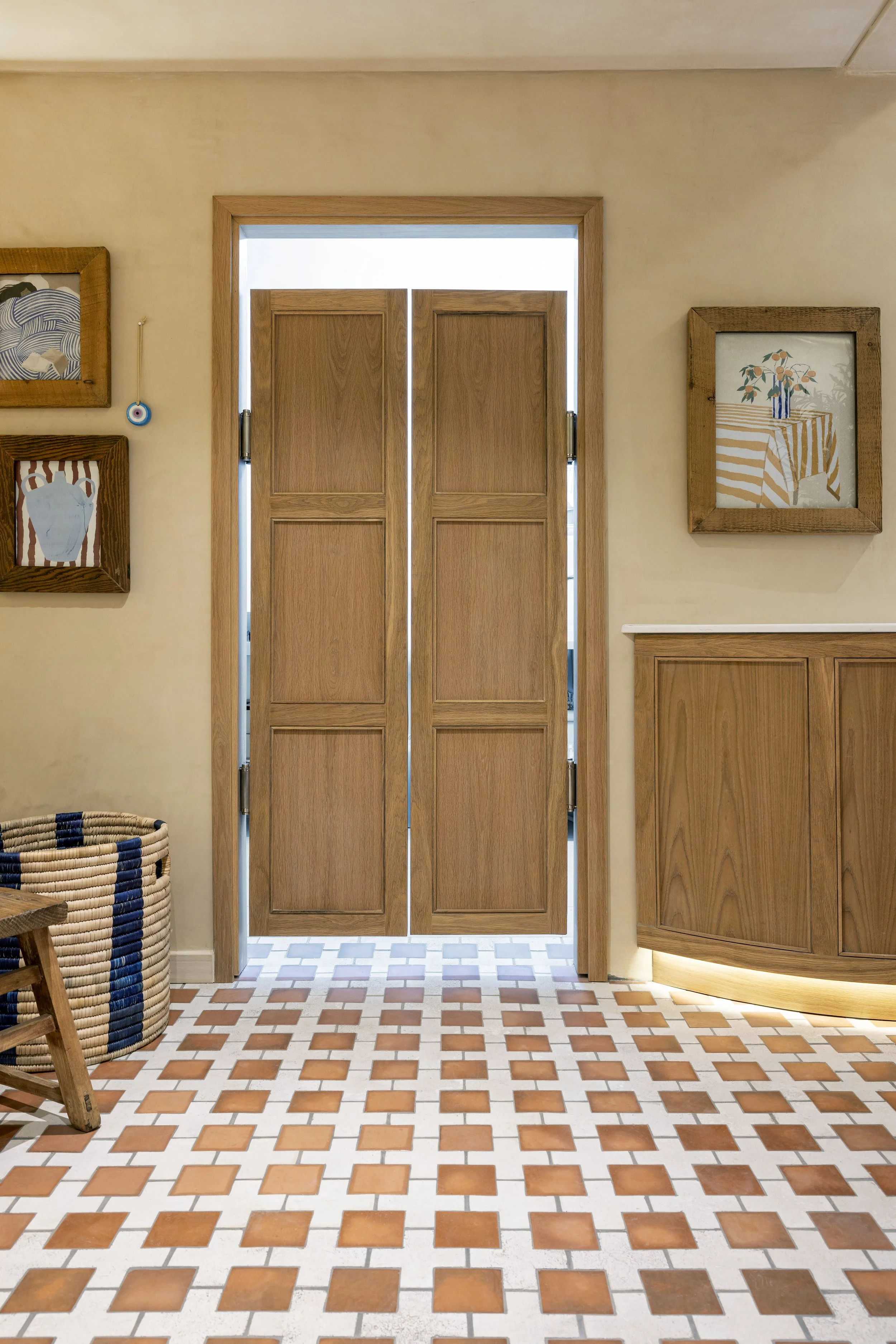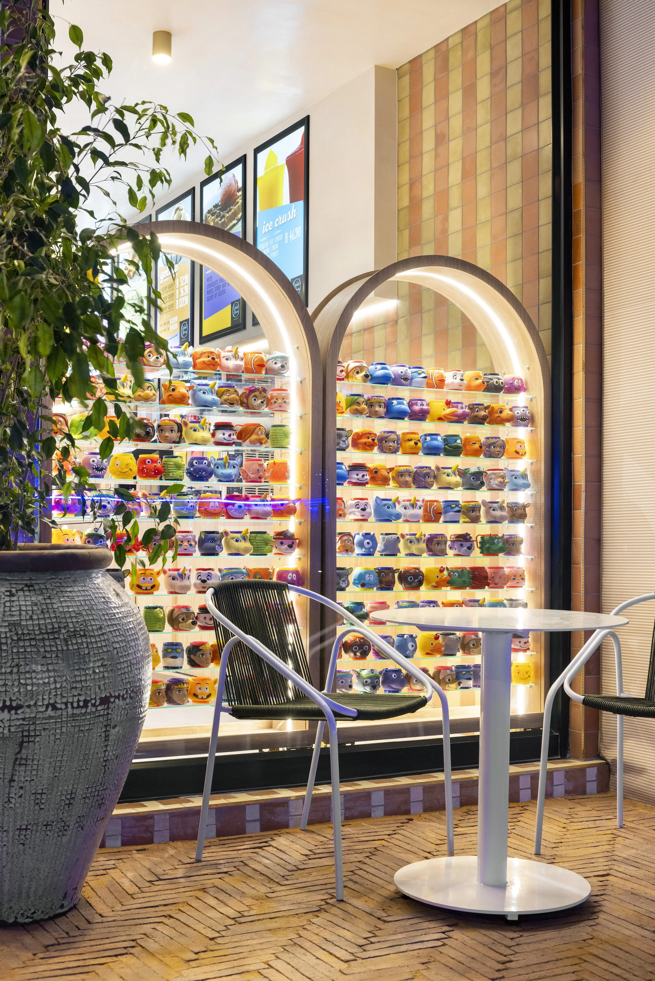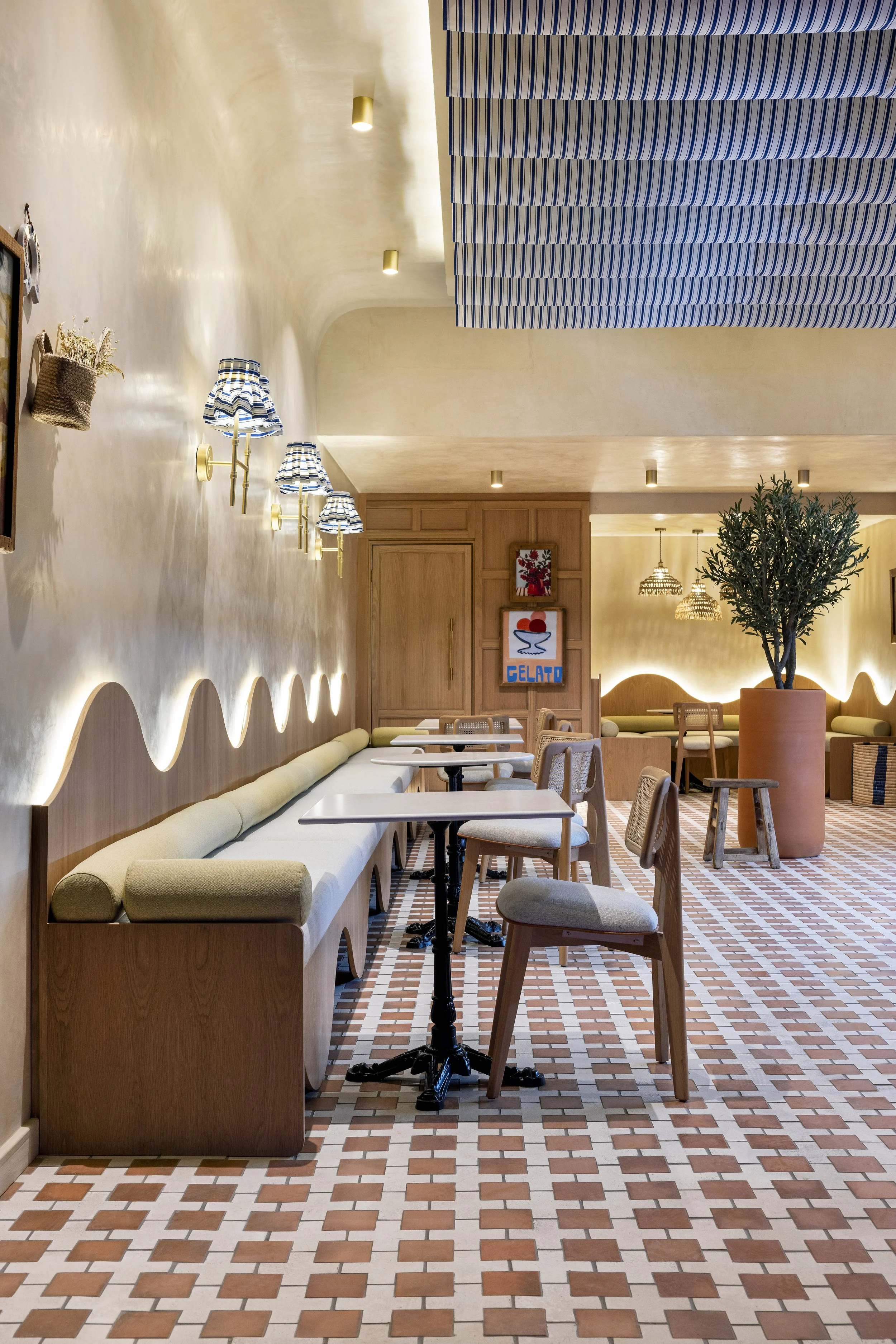 Gelato Mania Parkhurst, designed by Atelier Giorgio, is a sun-kissed homage to the relaxed elegance of the Greek islands. Inspired by Cycladic charm and Mediterranean nostalgia, the space brings a breezy sense of escape to Johannesburg’s beloved Parkhurst strip. Terracotta and white tiled flooring recalls traditional island courtyards, while blue-and-white striped lampshades and matching ceiling baffles echo the iconic hues of the Aegean. Soft wave-lit banquettes, warm timber accents, and a central olive tree infuse the interior with a sense of effortless serenity. From curated Greek-inspired décor to handcrafted materiality, Gelato Mania Parkhurst invites guests to savour their gelato as they would on a slow summer day in the Mediterranean—unhurried, sun-drenched, and joyfully stylish.